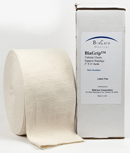The BiaGrip compressive stockinette is a tubular elastic support bandage that provides non-gradient compression. It is an economic alternative to provide mild compression. It is latex-free, can be cut to length, and can be washed and reused.
