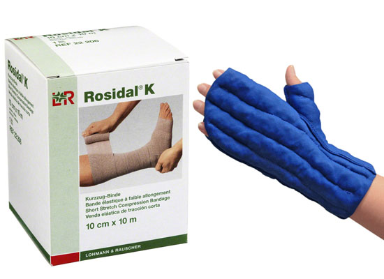 Caresia Bandage Liners simplify complex multi-layered bandaging protocols by providing an alternative to foam liners, stockinette, and gauze. Caresia garments are designed for the active phase of therapy and are manufactured with the same technology as Solaris' custom Tribute garments to maximize therapeutic results. Patients simply donn the Caresia then wrap the recommended series of bandage layers on top of the bandage liner. This liner is now bundled with two rolls of Rosidal K. This 100% cotton, breathable, short stretch bandage provides strong compression support of the extremities for the treatment of acute and chronic lymphedema, venous edema, and post-traumatic swelling. Rosidal K clings and conforms to help prevent slipping and the firm grip fabric texture provides added support to ensure that the bandage layers hold securely. Rosidal K is machine washable and reusable.