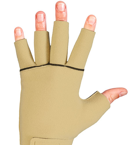 The Juxta-Fit™ Essentials Custom Glove gives hand coverage from the wrist to the mid-fingers. The garment can be made to fit almost any hand shape and is covered by a six month limited warranty. It features: (1) cool, light-weight, Breathe-O-Prene® material; (2) an anti-odor SILVERtec™ lining; (3) limited linear stretch material that hugs the limb. It is machine washable.