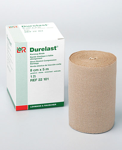 Durelast is a short stretch textured bandage made from cotton and polyamide and is capable of providing highly compressive support and durable elasticity suitable for the most demanding applications including the treatment of acute and chronic lymphedema, venous edema, and post-traumatic swellings. This bandage is breathable and well tolerated by the skin. The firm grip fabric texture ensures that the bandage layers hold securely.