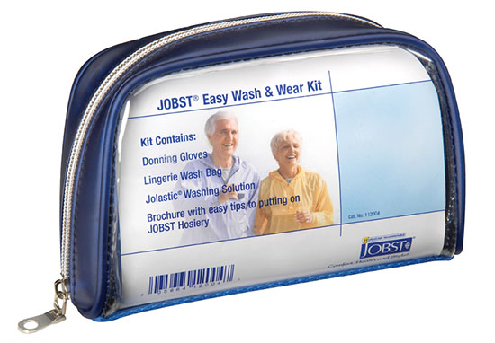 The Jobst Easy Wash and Wear Kit includes everything needed to apply and extend the life of your compression hosiery. The kit contains a 4-ounce bottle of Jolastic washing solution, one pair of Jobst donning gloves, one hosiery wash bag, and a donning brochure with helpful hints for putting on hosiery. It comes in a convenient carry case ideal for easy transport on the go.