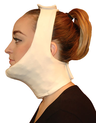 The Standard Chin Strap was designed to address edema of the neck, mandible, and the anterior/lateral aspects of the face. The open next seam creates a pocket between the two layers of fabric, which can accommodate your choice of padding. Hook and loop fastener straps at the neck and top of the head can be adjusted to the patients comfort level, making the garment suitable for overnight wear.