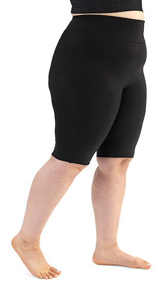 Compression outerwear, designed for lymphedema, the Sigvaris Compreshape Shorts offer 10-15 mmHg of compression with smooth seams and a stylish waistband for all-day comfort. Sigvaris Compreshape Shorts feature: (1) premium material for containment and coverage for daily wear; (2) stylish waistband design with abdominal coverage; (3) smooth seams for an attractive appearance and enhanced comfort; (4) a wide size range to accommodate all waist sizes; (5) mild, supportive 10-15 mmHg compression for the treatment of abdominal, truncal, and upper thigh edema; (6) durable construction that's easy to maintain and is washable