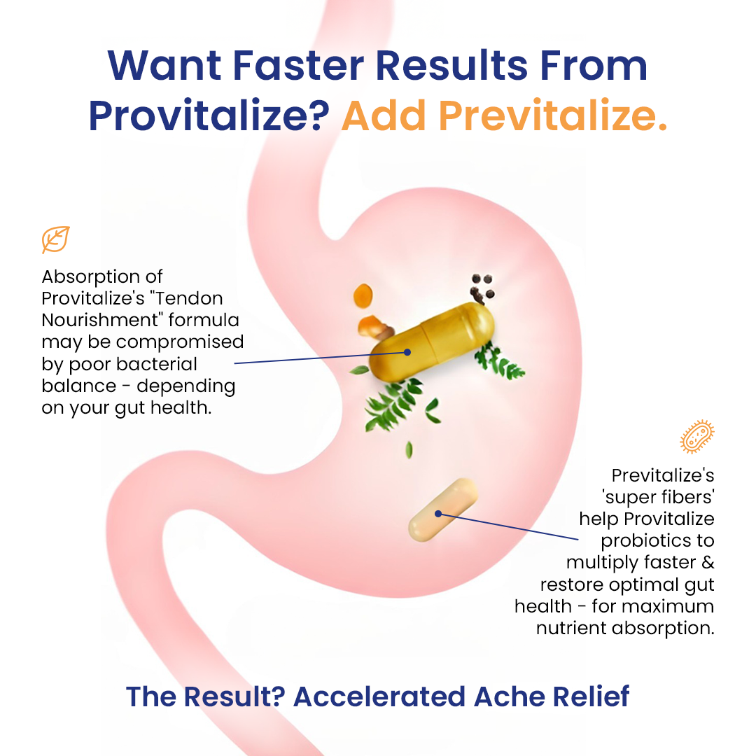 Previtalize is a super prebiotic blend. It works by “feeding” the probiotic strains found in Provitalize. As you may be aware, it takes 2-4 weeks for the probiotic strain to fully take root and germinate in the gut. By feeding it with prebiotic, they can enhance the impact of probiotics.