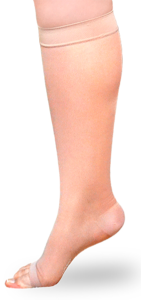 ExoSheer knee-high stockings blend form and function with a soft, silky fabric that is easy to put on and wear underneath any type of clothing. It features: (1) a wide band that helps reduce rolling and keep stockings in place; (2) a silky elastic material that makes donning and doffing easy; (3) a lightweight fabric that provides maximum breathability
