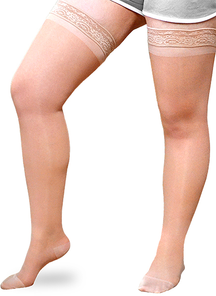 ExoSheer thigh-high stockings provide full length coverage for mild swelling and offer the look of ordinary stockings. They feature: (1) wide elastic lace bands that help reduce rolling and keep stockings in place throughout the day; (2) a silky elastic material that makes donning and doffing easy; (3) a lightweight fabric that provides maximum breathability