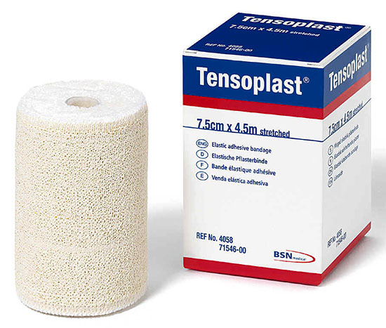 Tensoplast is a heavyweight elastic adhesive bandage. It is manufactured from 100% cotton. The zinc oxide adhesive gives Tensoplast excellent initial and long-term adhesion. Product benefits incluce: (1) helps control and reduce post injury and post-surgical edema by providing excellent compression and support; (2) water repellent properties protect the bandage from soaking and soiling; (3) high adhesive properties allow the bandage to withstand the stress of sporting activity; (4) high twist chain-link threads woven into the backing material provide elasticity; (5) molds to body contours while stretching without displacement