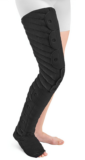 The Solaris Tribute Wrap Full Leg is an off-the-shelf adjustable foam compression garment for the self-management of lymphedema or other edema in the leg. It is intended for use during the evening, night, or other low activity periods. It comfortably adjusts to the shape of your leg and lifestyle to help maintain gains made during therapy, while allowing the flexibility to support further reduction. It also offers great features to benefit maintenance therapy: (1) durable hook and loop straps and easy-to-pull finger grip holes for easy donning; (2) Coolcore fabric that rapidly wicks away sweat and moisture to regulate body temperature to keep you cool and comfortable; (3) proven foam technology to soften fibrotic tissue and support skin health; (4) chevron channeling based on MLD principles of directing fluid to the collateral pathways; (5) includes complimentary Sleep Sleeve to ensure the straps do not get tangled in the sheets