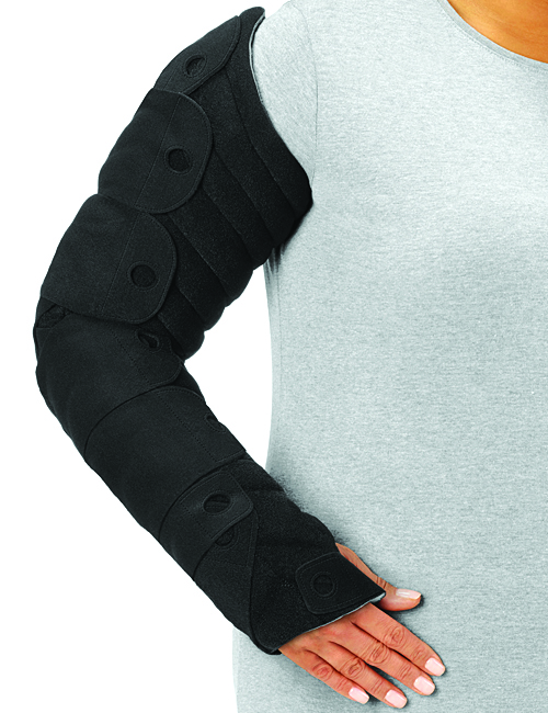 The TributeWrap MCP to Axilla is an off-the-shelf adjustable foam compression garment for lymphedema or other edema management of the arm. It is intended for use during the evening, night, or other low activity periods. It comfortably adjusts to the patient's unique arm shape and lifestyle to help maintain gains made during therapy, while allowing the flexibility to support further reduction. It also offers great features to benefit maintenance therapy: (1) durable hook and loop straps and easy-to-pull finger grip holes for easy donning; (2) Coolcore fabric that rapidly wicks away sweat and moisture to regulate body temperature to keep you cool and comfortable; (3) proven foam technology to soften fibrotic tissue and support skin health; (4) chevron channeling based on MLD principles of directing fluid to the collateral pathways; (5) includes complimentary Sleep Sleeve to ensure the straps do not get tangled in the sheets; (6) angled straps and darting at the elbow to support freedom of movement